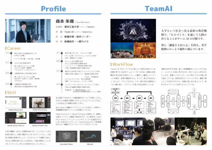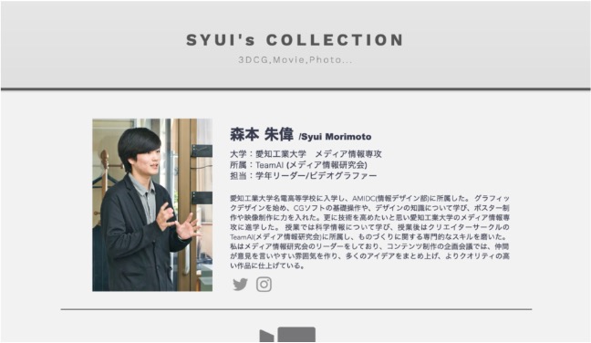 名電高校の情報科に入学後、CGデザインを学び初め、人に見せるものづくりに興味をもつ。CG制作の幅を広げるため、愛知工業大学のメディア情報専攻に進学し、3Dモデリングやパーティクルの知識を習得した。高校から大学までクリエイターサークルに所属し、数多くの映像作品を手掛けてきた。